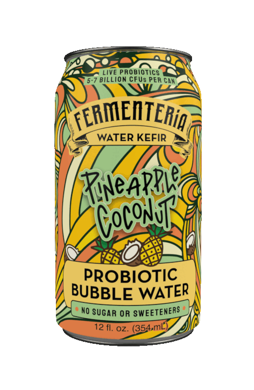 Fermenteria Water Kefir brings your gut a party of live probiotics in every refreshing sip! Crafted with just 5 clean ingredients—triple carbon-filtered water, fermented water kefir culture, organic raw cane sugar (fully fermented out), and natural pineapple & coconut extracts. Experience the tropical escape of pineapple coconut while nourishing your body with beneficial probiotics! 10-12 Billion CFUs in each can & NO SUGAR/SWEETENERS!